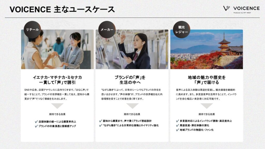 VOICENCEは、広告の枠を超え、店舗、アプリ、商談、さらにはツーリズムに至るまで、あらゆる顧客接点において「ブランドの人格」を一貫させ、拡張していく試みです。