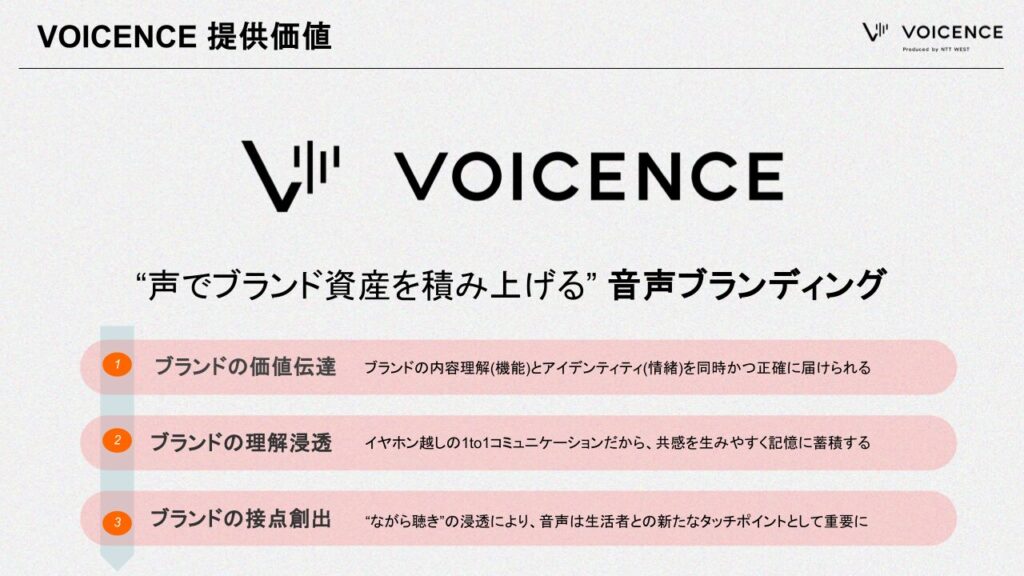 私たちVOICENCEが提唱する「音声ブランディング」とは、IPの「あの声」を権利保護された音声AIによって展開することで、聴覚を通じたブランドの接点、体験、結びつきをこれまで以上に増やす手法のことです。