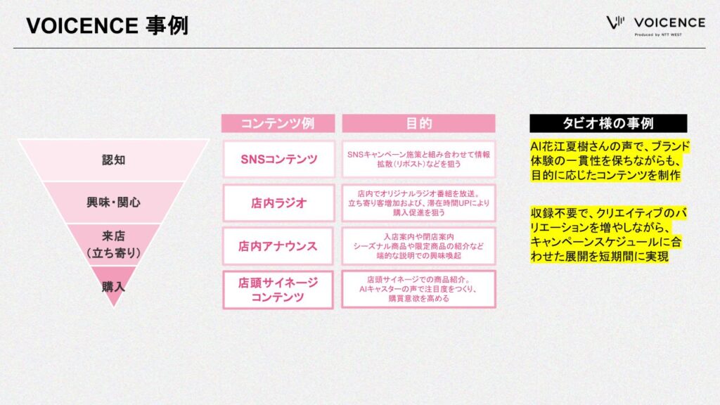タビオ様は、「ECが好調な今だからこそ、リアル店舗でしか味わえないブランド体験を強化したい」と考え、そのために、全国の店舗でブランドを象徴する「特定の声」に統一。AI花江夏樹さんの声で、ブランド体験の一貫性を保ちながらも、目的に応じたコンテンツを制作しました。